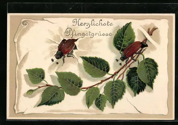 Präge-AK Zwei Maikäfer auf Papier mit Birkenzweig, Pfingstgruss