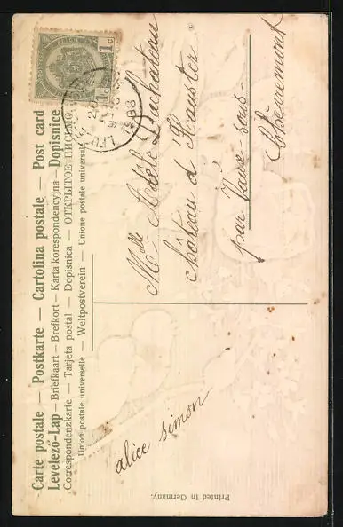 Personenbezogene Daten auf der Rückseite der Karte wurden durch blauen Textmarker unkenntlich gemacht. Die blauen Stellen sind auf die Vorderseite durchgeweicht und wirken sich negativ auf das Postkartenfoto aus