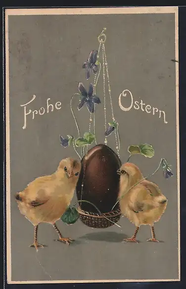 Präge-AK Zwei Osterküken mit Osterei im Korb, Ostergruss