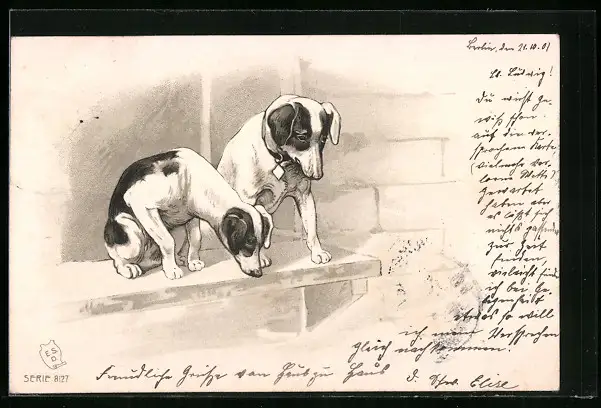 Präge-AK Zwei Terrier schauen von einem Fensterbrett