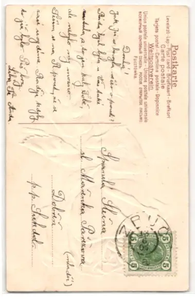 Personenbezogene Daten auf der Rückseite der Karte wurden durch blauen Textmarker unkenntlich gemacht. Die blauen Stellen sind auf die Vorderseite durchgeweicht und wirken sich negativ auf das Postkartenfoto aus
