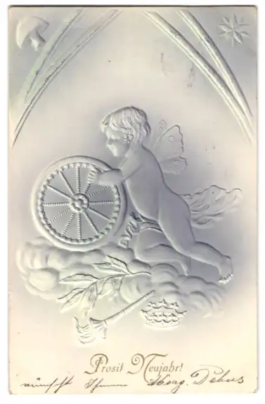 Präge-Airbrush-AK Elfe mit Krone und Rad zu Neujahr