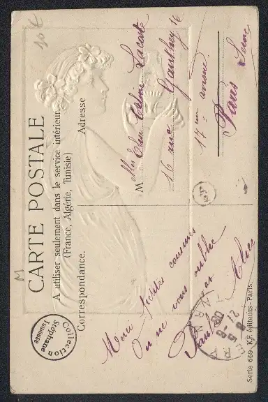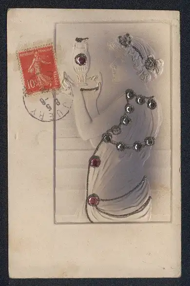 Präge-Airbrush-AK Frau mit Amphore und aufgeklebten Glitzersteinen