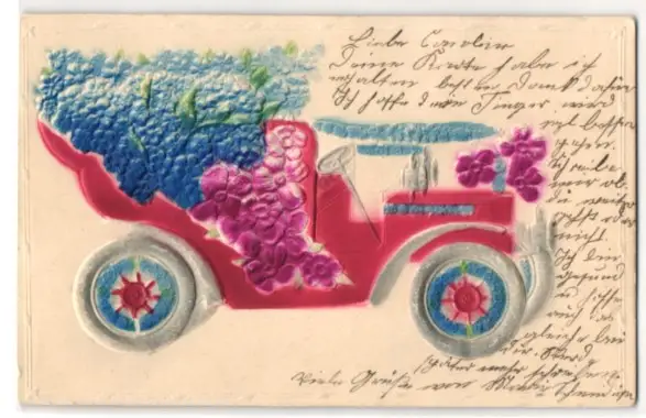 Präge-Airbrush-AK Mit Blumen beladenes Automobil