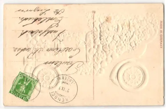 Personenbezogene Daten auf der Rückseite der Karte wurden durch blauen Textmarker unkenntlich gemacht. Die blauen Stellen sind auf die Vorderseite durchgeweicht und wirken sich negativ auf das Postkartenfoto aus