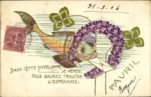 Präge Ak 1. April, 1er Avril, Vermenschlichter Fisch als Postbote, Hufeisen, Kleeblätter