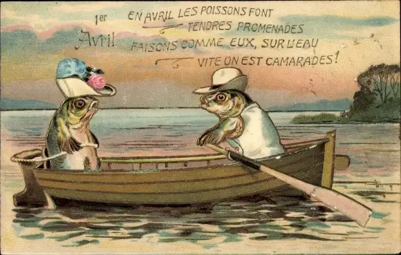 Präge Ak 1. April, Vermenschlichte Fische im Ruderboot