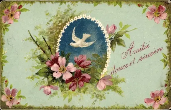 Präge Ak Amitie douce et sincere, Heckenrosen, Taube
