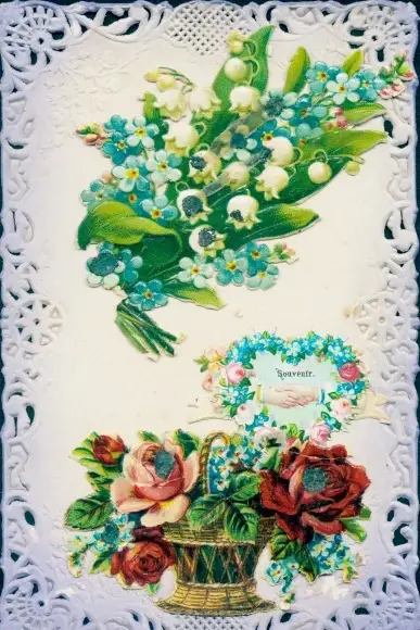 Präge Ak Blumenkorb, Blumenstrauß, Rosen, Maiglöckchen, Vergissmeinnicht