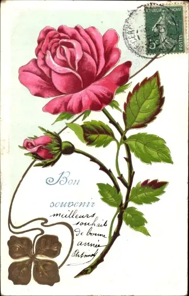 Präge Ak Bon souvenir, Rose, Glücksklee