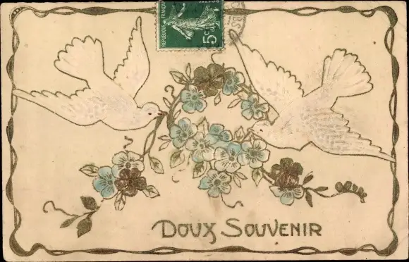 Präge Ak Doux Souvenir, Tauben, Vergissmeinnicht