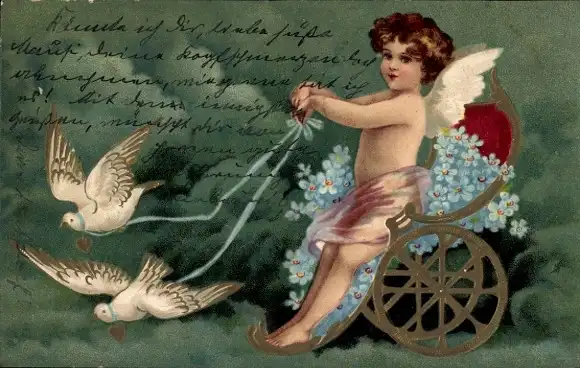 Präge Ak Engel, Blumen, Tauben, Vergissmeinnicht