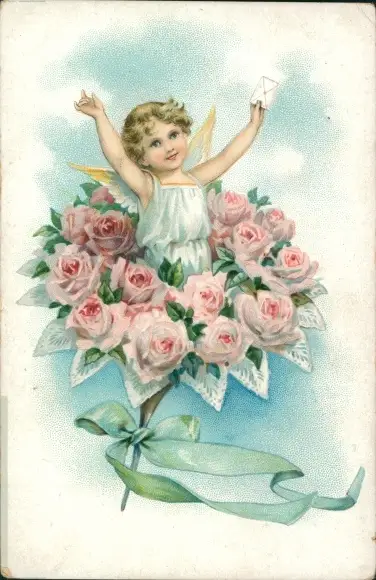 Präge Ak Engel, Briefumschlag, Rosen, Schleife