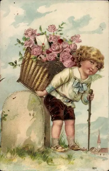 Präge Ak Engel, Korb mit Rosen, Gehstock, Kitsch