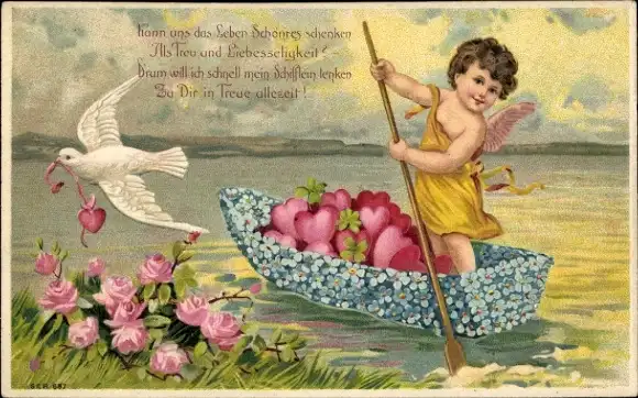 Präge Ak Engel im Ruderboot, Blumen, Taube, Rosen