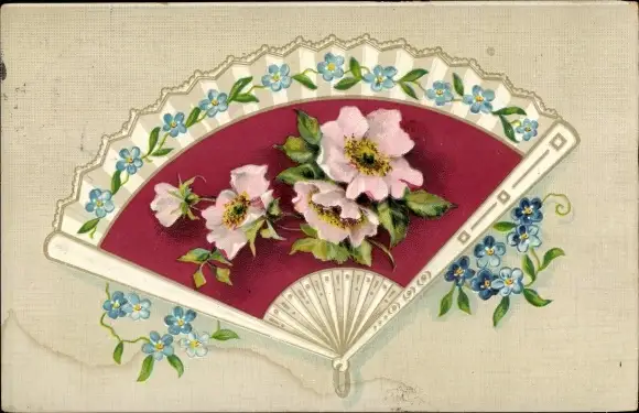 Präge Ak Fächer, Rosen, Vergissmeinnicht