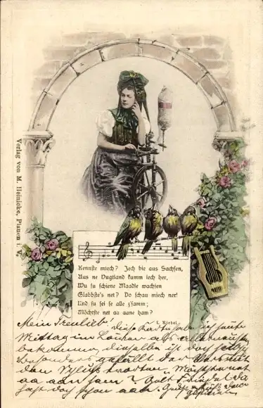 Präge Ak Frau in Tracht, Spinnrad