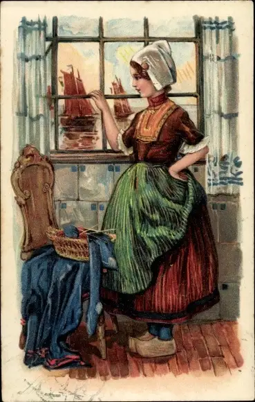 Präge Ak Frau in holländischer Tracht, Häkelgarn