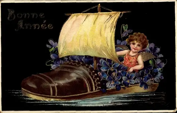Präge Ak Fröhliches Neujahr, Engel, Schuh als Segelboot, Veilchen