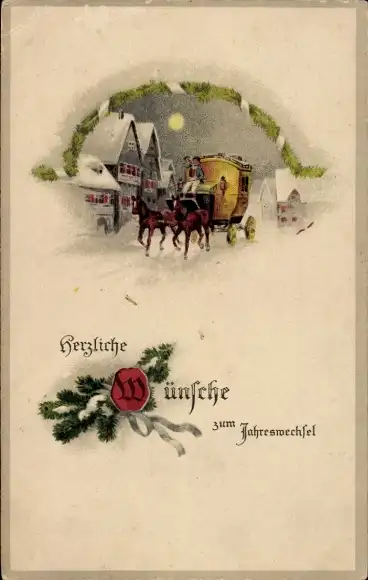 Präge Ak Fröhliches Neujahr, Winterliche Straße, Postkutsche