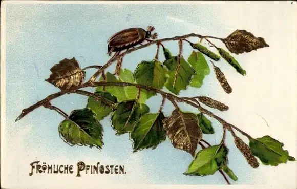 Präge Ak Frohe Pfingsten, Maikäfer auf Birkenzweig