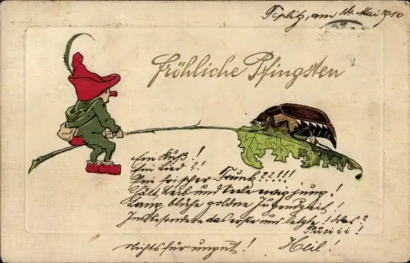 Präge Ak Frohe Pfingsten, Zwerg, Maikäfer auf einem Blatt