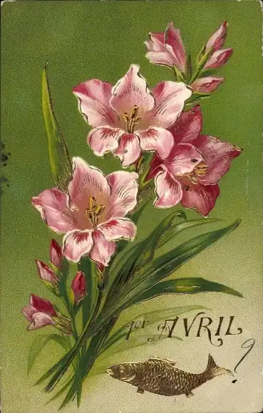 Präge Ak Glückwunsch 1. April, Blumen, Fisch