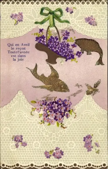 Präge Ak Glückwunsch 1. April, Fische, Veilchen