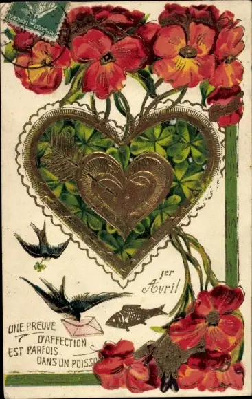 Präge Ak Glückwunsch 1. April, Herz, Glücksklee, Blumen, Schwalben