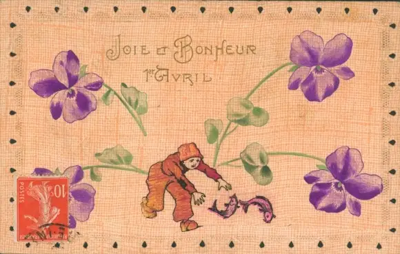 Präge Ak Glückwunsch 1. April, Kind, Fische, Veilchen