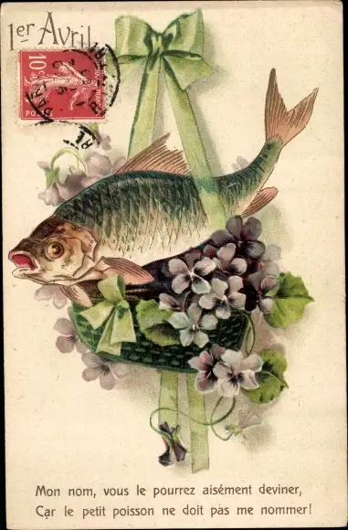 Präge Ak Glückwunsch 1. April, Schleife, Fisch, Blumen