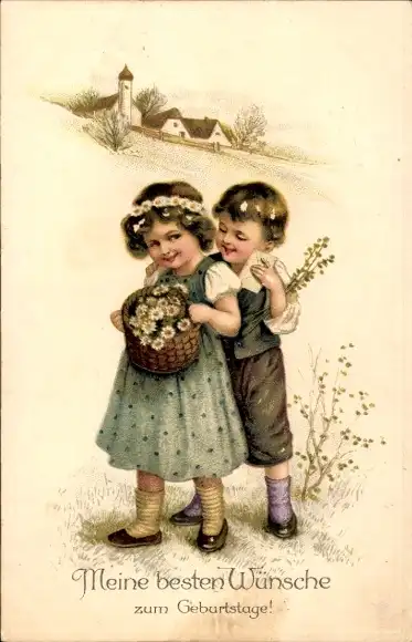 Präge Ak Glückwunsch Geburtstag, Blumenkorb, Mädchen, Junge