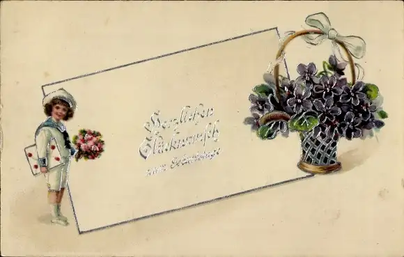 Präge Ak Glückwunsch Geburtstag, Junge im Matrosenanzug, Korb mit Blumen