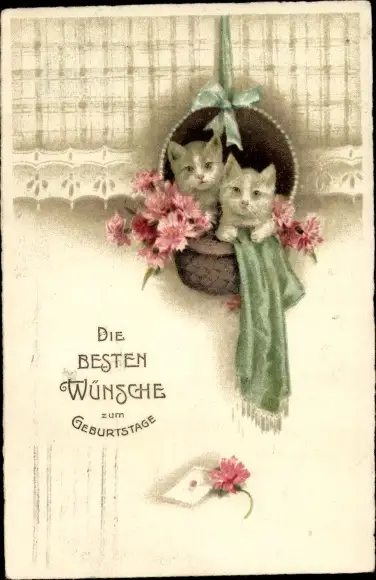 Präge Ak Glückwunsch Geburtstag, Katzen im korb, Blumen