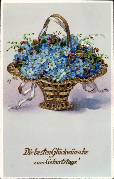 Präge Ak Glückwunsch Geburtstag, Korb mit Vergissmeinnicht