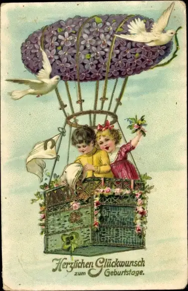 Präge Ak Glückwunsch Geburtstag, Tauben, Blumen, Fesselballon, Kitsch