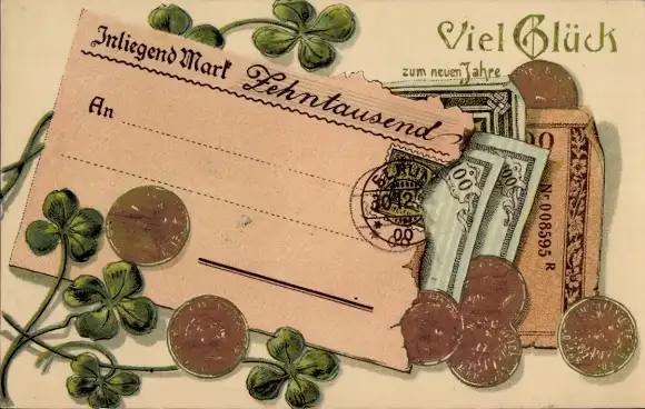 Präge Ak Glückwunsch, Geldscheine, Münzen, Glücksklee