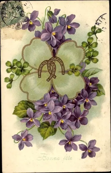 Präge Ak Glückwunsch, Hufeisen, Kleeblätter, Veilchen
