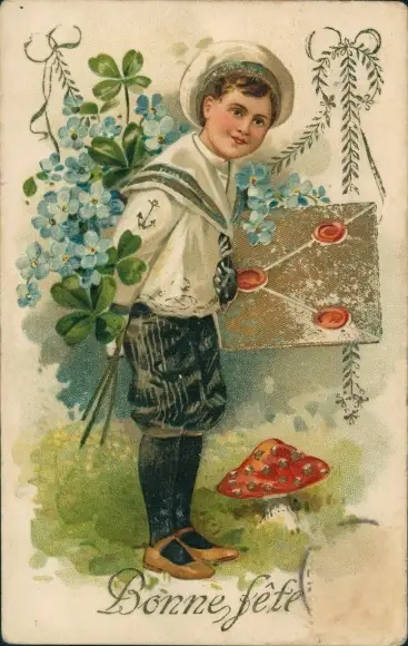 Präge Ak Glückwunsch, Junge, Brief, Vergissmeinnicht, Pilz, Glücksklee