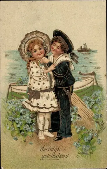 Präge Ak Glückwunsch, Junge im Matrosenanzug, Mädchen, Boot, Vergissmeinnicht