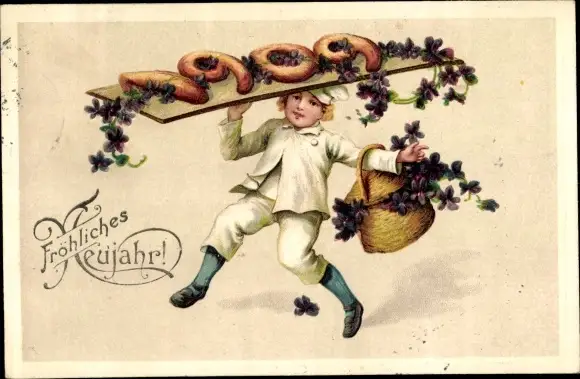 Präge Ak Glückwunsch Neujahr 1909, Kind mit Backwaren, Blumen
