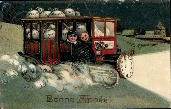 Präge Ak Glückwunsch Neujahr, Auto mit Geldsäcken, Uhr