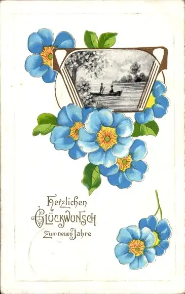 Präge Ak Glückwunsch Neujahr, Blaue Blumen, Ruderboot