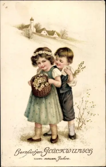 Präge Ak Glückwunsch Neujahr, Blumenkorb, Mädchen, Junge, Schneelandschaft