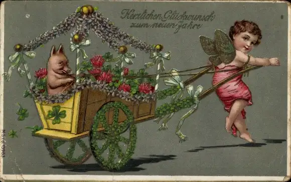Präge Ak Glückwunsch Neujahr, Enge, Schwein, Karre, Glücksklee