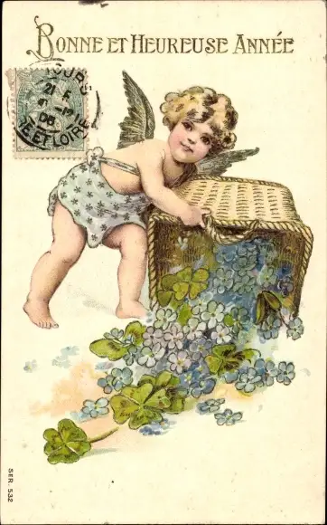 Präge Ak Glückwunsch Neujahr, Engel, Blumenkorb, Glücksklee
