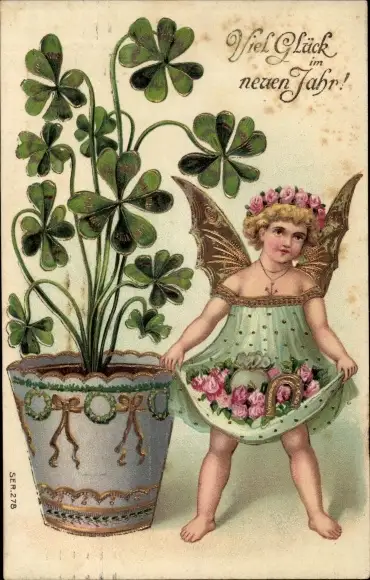 Präge Ak Glückwunsch Neujahr, Engel, Blumentopf, Glücksklee