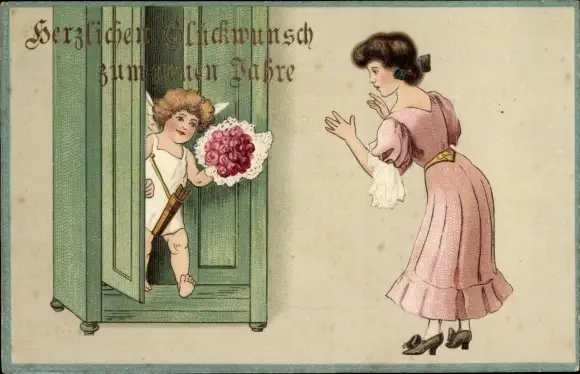 Präge Ak Glückwunsch Neujahr, Engel mit Blumenstrauß, Schrank