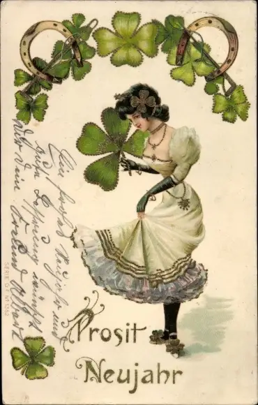Präge Ak Glückwunsch Neujahr, Frau, Glücksklee, Hufeisen