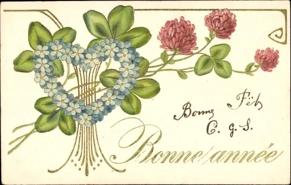 Präge Ak Glückwunsch Neujahr, Glücksklee, Vergissmeinnicht